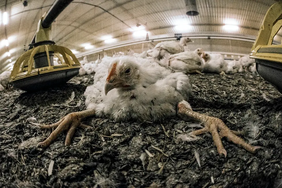 LAYER CHICKENS Layer chickens lay 90-95% of the eggs sold in the U.S. Newborn chicks are placed on a conveyor belt where a worker picks each one up to see if it is male or female. Newborn males are placed in trash bags and suffocated, decapitated, gassed, crushed, or ground up alive. Newborn females are placed back on the belt. The next worker then picks up the female chick, holds her up to a machine's hot iron which cuts off her beak, and then places her back on the belt. The beaks of these birds are removed because five to eight of them are crammed into 14 square inch cages, cages so small that the birds cannot even spread their wings. Such close confinement, which averts their natural social order, causes aggression among the birds. Debeaking prevents them from harming one another, which would make their corpses less profitable to the farmers. It is a painful practice that involves slicing through bone, cartilage, and soft tissue. The floors of layer hens' "battery cages" are made of extremely uncomfortable wire, which chafes their skin, rips out some of their feathers, bruises their bodies, and deforms their feet. The cage floor slopes at the bottom, so weaker hens are often crushed on the cage base. Layer hens' bones are so brittle that they often shatter during handling. Approximately one in five dies of stress and disease. Others are ground up and turned into animal feed on site. Forced Molting Parkhurst investigation - chicken farmLayer hens are exposed to light constantly so that they will lay more eggs. At the end of their laying cycle, they are killed or subjected to "forced molting," a process that entails withholding food and water for up to 18 days and keeping them in darkness so that their bodies are shocked into another laying cycle. Many of the birds who undergo forced molting die from fatigue. Diseases Common to Layer Hens: